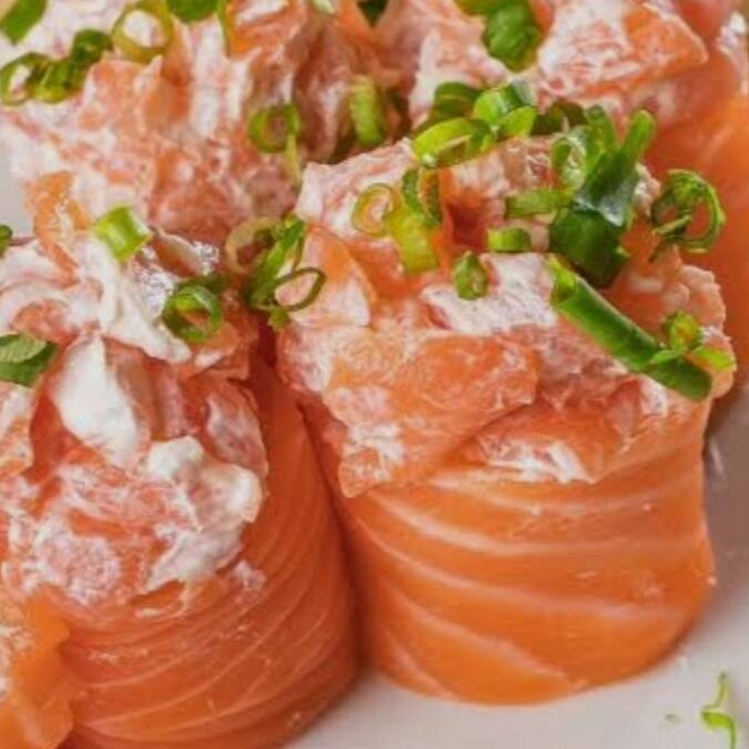 Sushi recheado com salmão creme chese com uma fina fatia de salmão em cima e gegilim