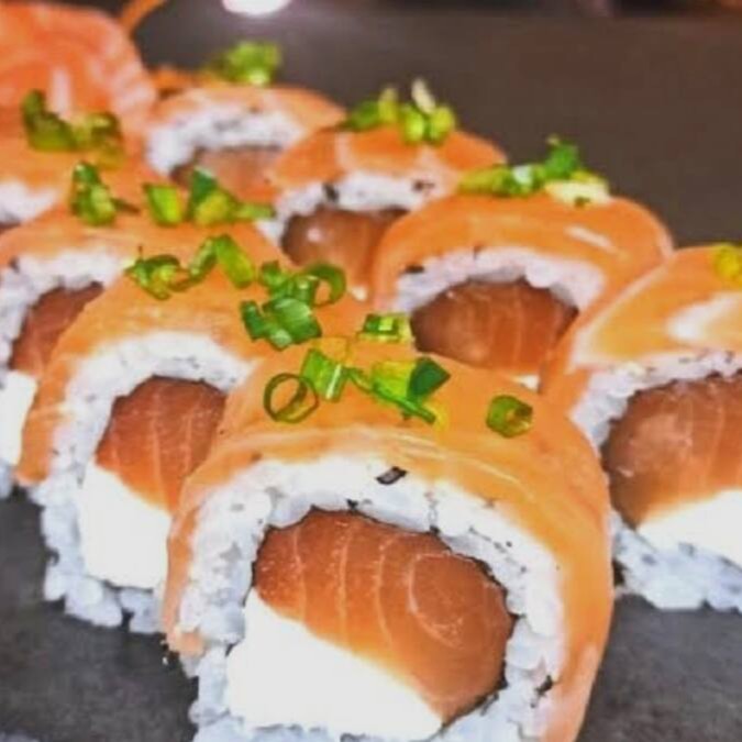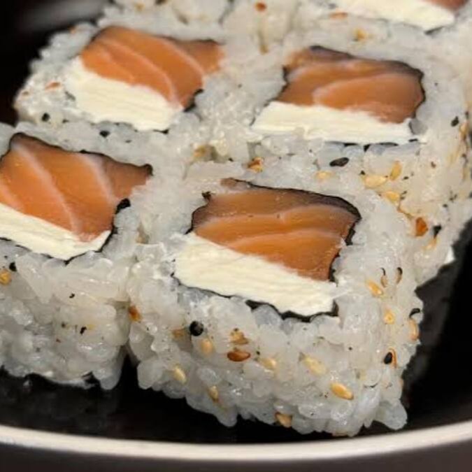 Sushi recheado com cubos de salmão e creme chese e gegilim