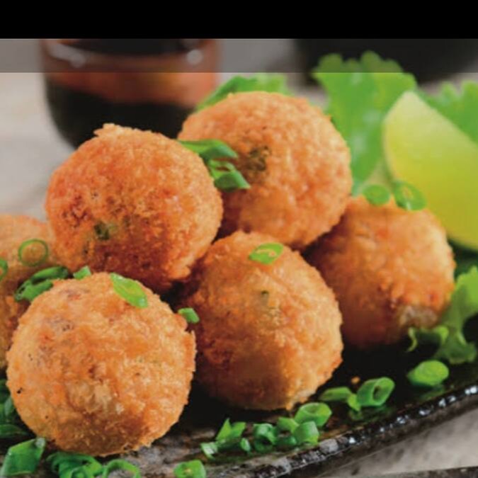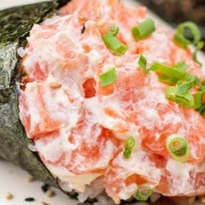 Bolinho de salmão,arroz envolto em salmão batido com cebolinha