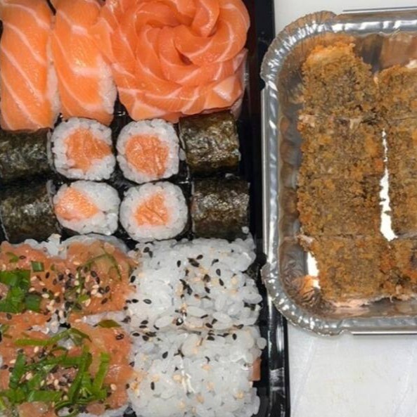 5 Sashimi de salmão,2 niquiri de salmão,4un uramaki Jô,4 uramaki filhadefia,8 shake maki e 8 Hot Filadélfia