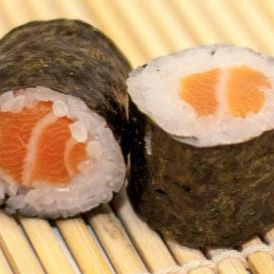 Salmão, arroz japonês, nori, cebolinha e gergelim.