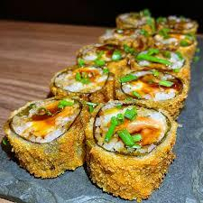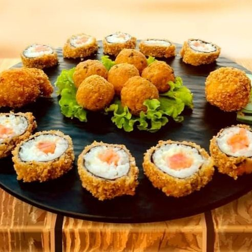 Sushis fritos recheados com cream chesse, goiabada e morango