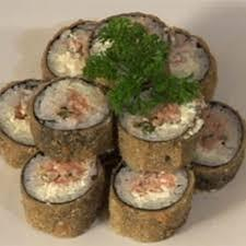 Pele de salmão grelhada e cream cheese enrolados com arroz