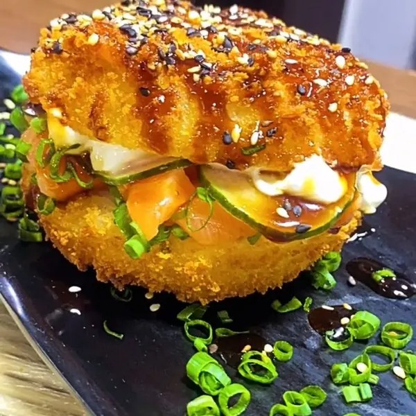 Arroz temperado com cream cheese e cebolinha em formato de hamburguer, empanado na farinha panko, recheado com pepino agridoce e salmão, finalizado com molho tarê e gergelim