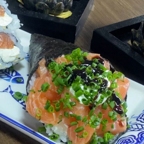 Uma saborosa porção de arroz, com patê com crean chease e salmão, e um toque especial de cebolinha.