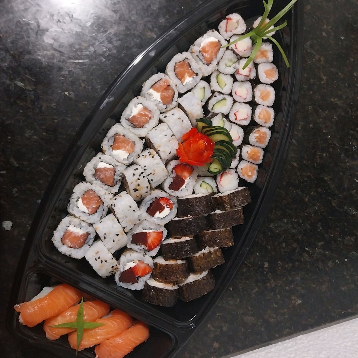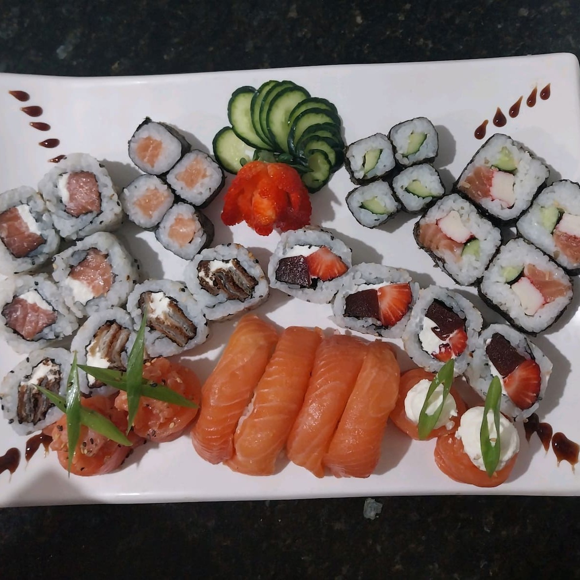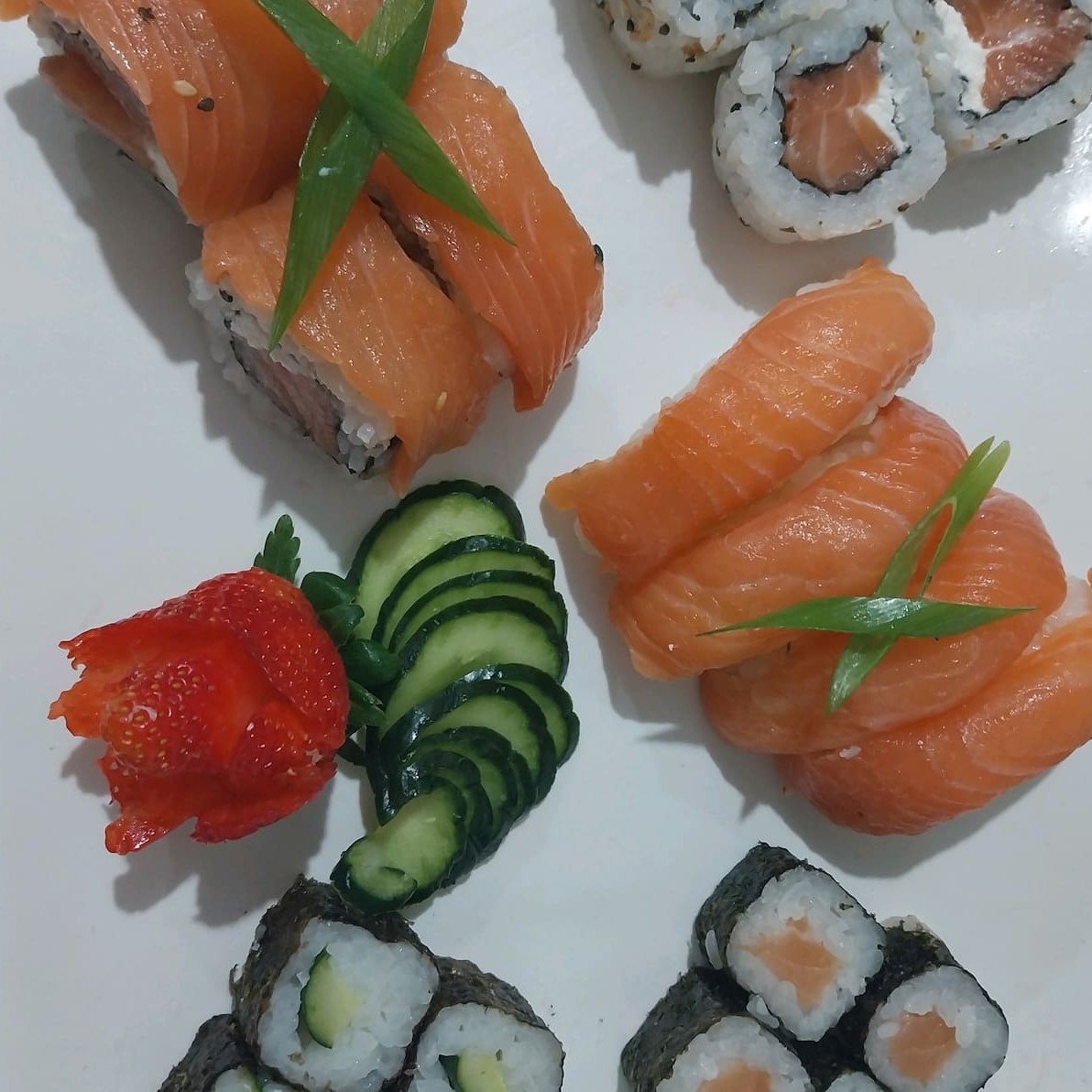 4 Niguiri de salmão 4 Niguiri skin 8 Hosso de pepino 8 Hosso de kani 8 Uramaki Niromaki 8 Uramaki skin 5 Futomaki de salmão 5 Futomaki de patê de salmão