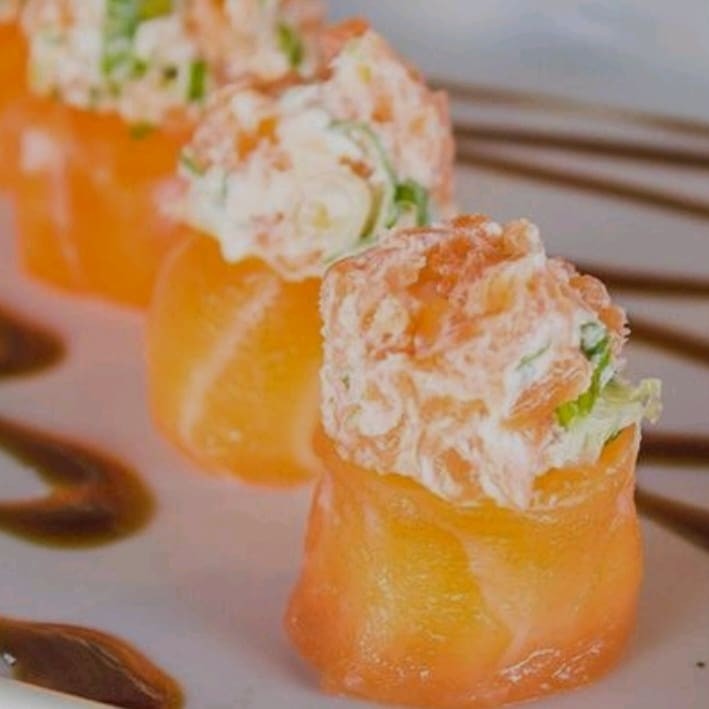 Bolinha de arroz envolto de fatia de salmão maçaricado e finalizado com cream chease e alho porò incrivelmente crocante Preço baixo promoção entregaràpida descontão off barato melhorpreço cupom