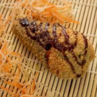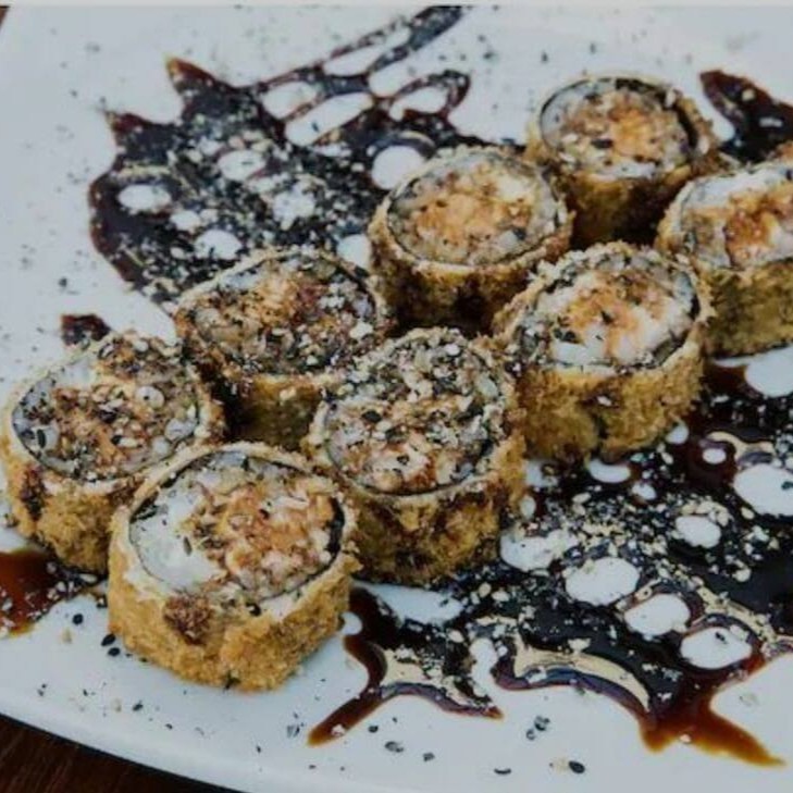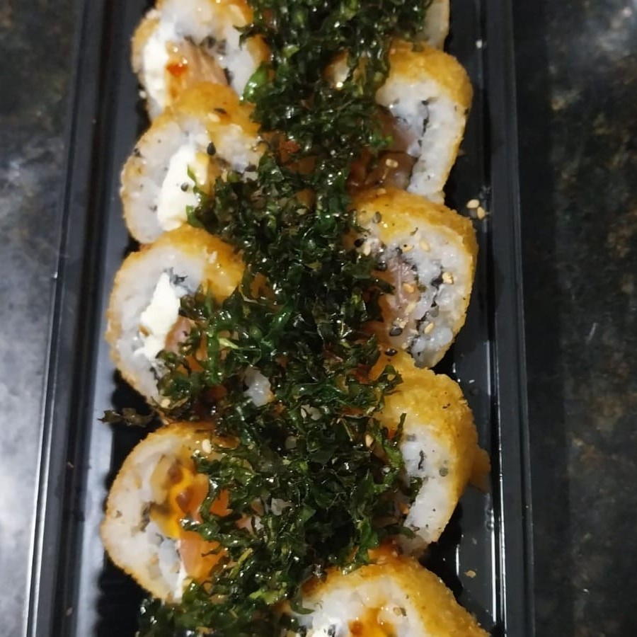 Arroz envolto em alga recheado com salmão grelhado e cream chease,empanado e frito,irresistivelmente crocante finalizado com tarê e mix de gergelin torrado. preço baixo promoção entregaràpida descontão off barato melhorpreço cupom