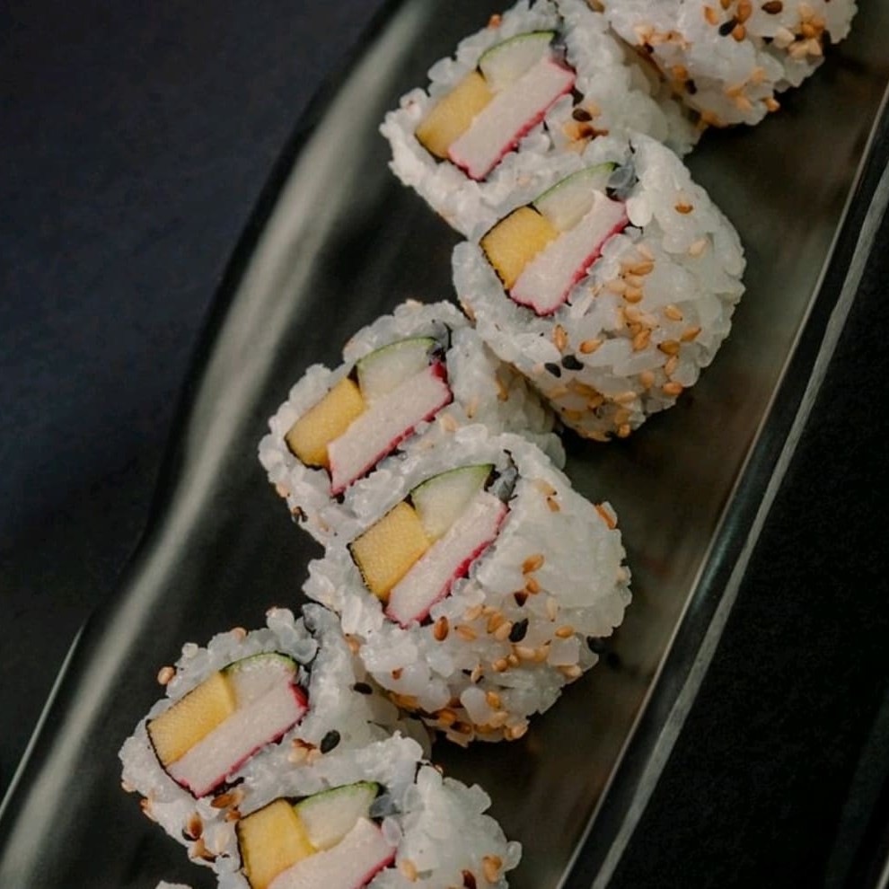 Arroz envolto em alga recheado com kani,manga e pepino preço baixo promoção entregaràpida descontão off barato melhorpreço cupom preço baixo promoção entregaràpida descontão off barato melhorpreço cupom