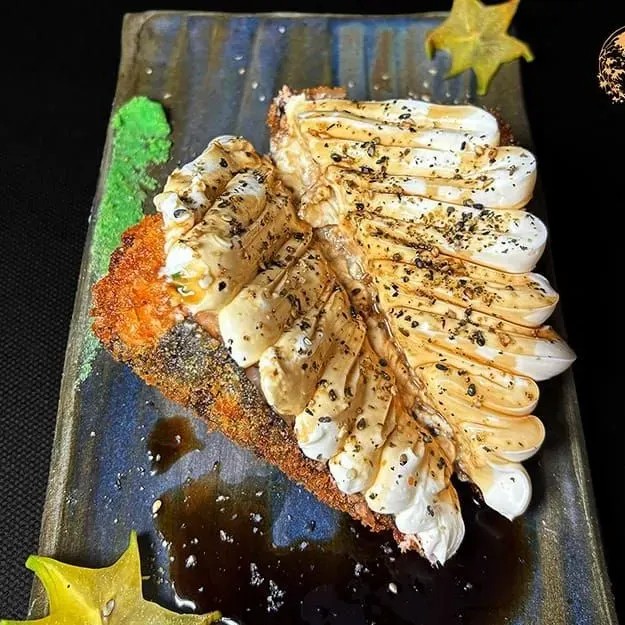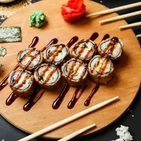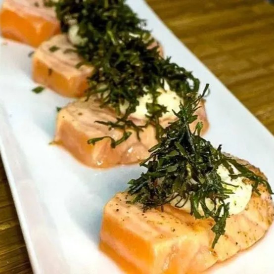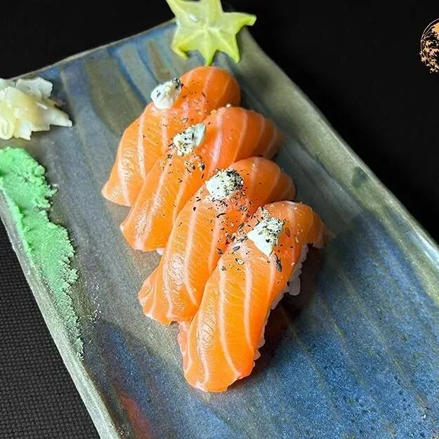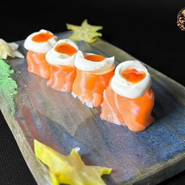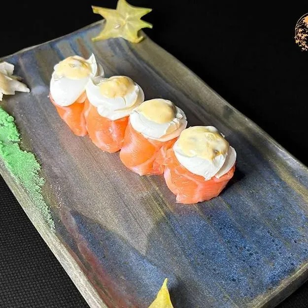 Delicie-se com 6 fatias de sashimi de salmão, cuidadosamente maçaricadas para um toque especial. Cada fatia vem acompanhada de um cremoso cream cheese, que harmoniza perfeitamente com o sabor do salmão. Após o flambado, o prato é finalizado com hondashi e uma camada de couve crispy, trazendo uma textura crocante e um sabor único a cada mordida. Uma experiência sofisticada e irresistível para os amantes de sushi.