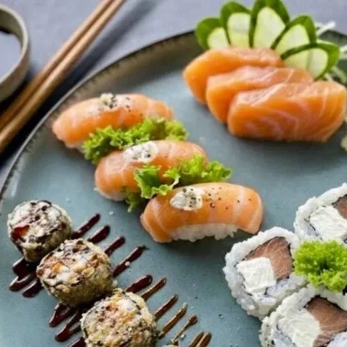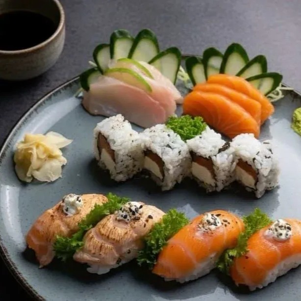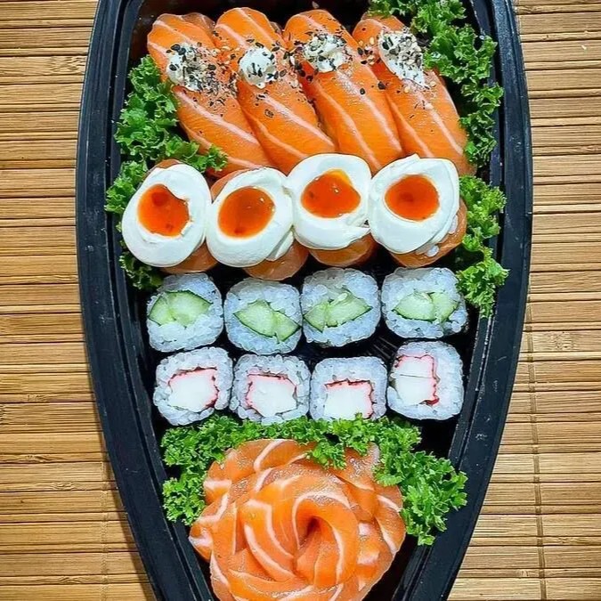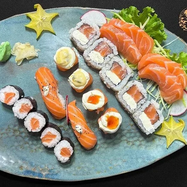 São: - 3 Sashimis de Salmão Fresco - 3 Sashimis de Tilápias Fresca - 4 Deliciosos Uramakis Filadélfia - 2 Niguiris de Salmão - 2 Niguirs de Salmão Maçaricados Acompanha: 1 Par de Hashi, 3 Shoyu, 3 Tarê, 1 Porta Shoyu.