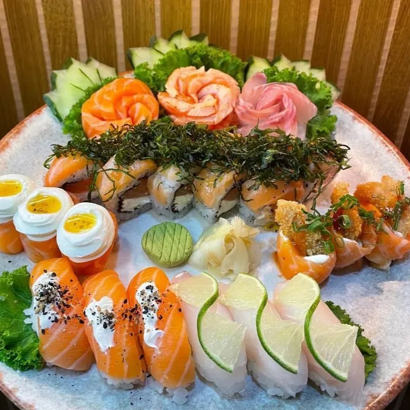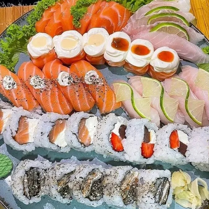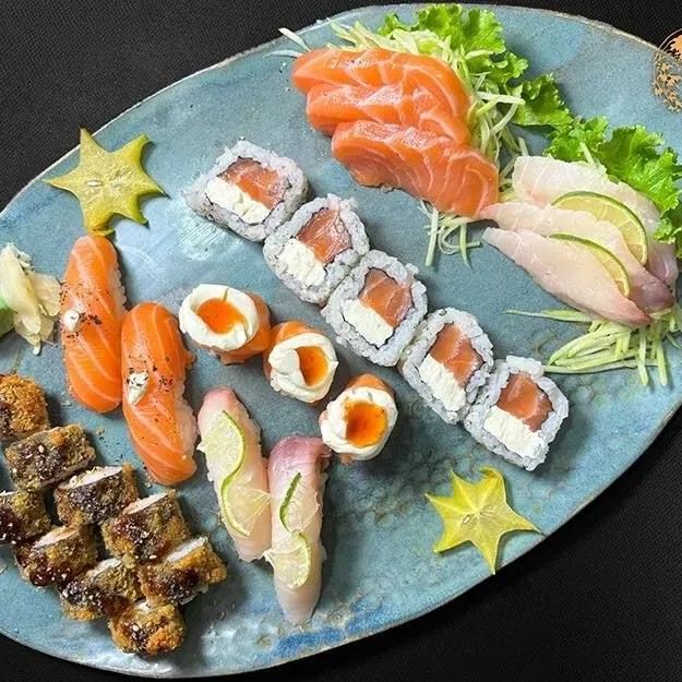Um combinado perfeito para os amantes de variedade! O melhor do sushi reunido em um só prato, cheio de sabores diferentes para você aproveitar. São: - 6 Sashimis entre Salmão e Peixe Branco - 5 Uramakis Filadélfia - 3 Joe Sweet Chilli - 2 Niguiri de Tilápia - 2 Niguiri de Salmão - 10 Hots Filadélfia - Wasabi - Gengibre Acompanha: 2 Hashi, 6 Shoyu, 6 Tarê, 2 Nozoki.