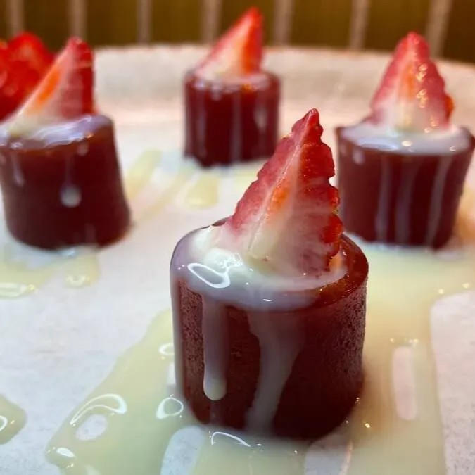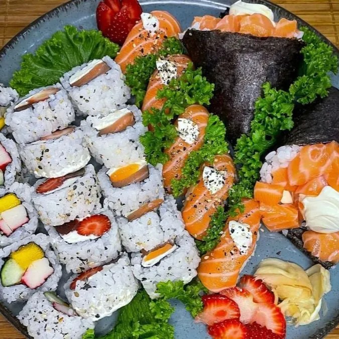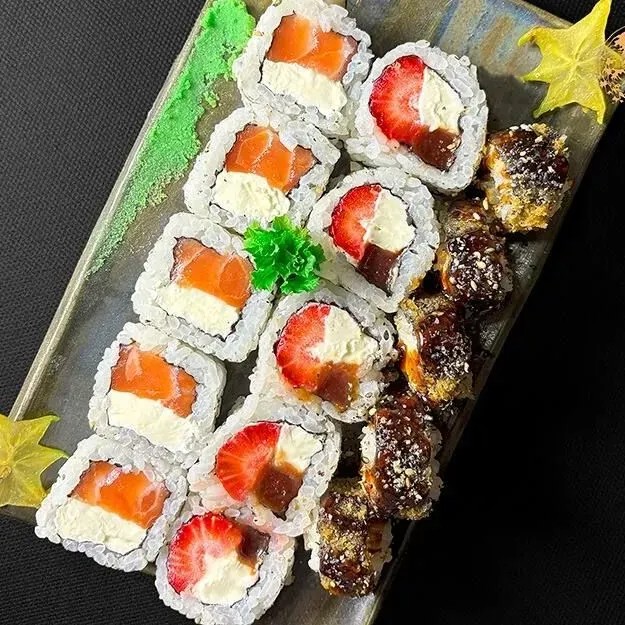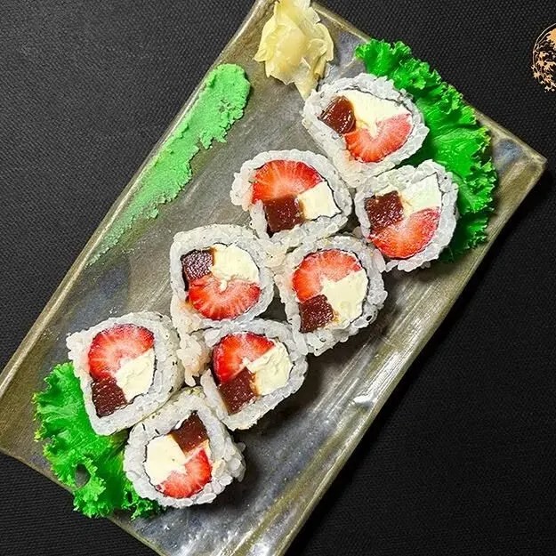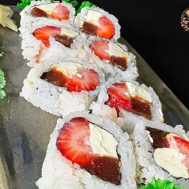 Delicie-se com o nosso uramaki Romeu e Julieta, uma combinação irresistível de cream cheese e a doce goiabada, com pedaços frescos de morango, arroz e nori, e finalizado com gergelim crocante, este uramaki traz um toque romântico e surpreendente à sua refeição. Uma fusão de sabores que vai encantar seu paladar.