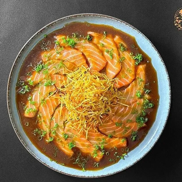 Apresentamos o nosso Carpaccio de Salmão: 12 fatias finas de salmão cuidadosamente marinadas em um molho de ostra exclusivo, desenvolvido especialmente em nossa cozinha. Acompanhado de batatas crispy, que proporcionam uma textura crocante e complementam perfeitamente o sabor delicado do peixe. Uma experiência de sabor refinado e apresentação impecável.