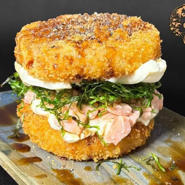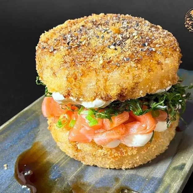 Descubra o ousado sabor do nosso Hambúrguer Filadélfia: uma releitura inovadora do clássico, com uma base crocante e surpreendente de arroz empanado e frito. Recheado com salmão fresco, cebolinha, cream cheese cremoso e crispy de couve, e finalizado com uma tare artesanal especial, cada mordida é uma explosão de texturas e sabores. Uma experiência única para os amantes de novas sensações.