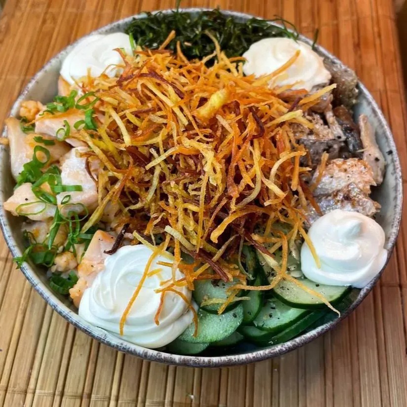 Uma explosão de frescor e sabor! Salmão grelhado suculento, combinado com ingredientes frescos - Base de Arroz Japonês - Suculentos pedaços de Salmão Fresco Grelhados em cubos -Sunomono leve e refrescante - Skin deliciosa e Crocante - Couve Crispy Crocante - Cream cheese cremoso e saboroso - Batata-doce Crispy Crocante - Finalizado com cebolinha e gergelim torrado Acompanha: 1 Hashi, 3 Shoyu, 3 Tarê. Caso queira remover alguma coisa, basta colocar na observação.
