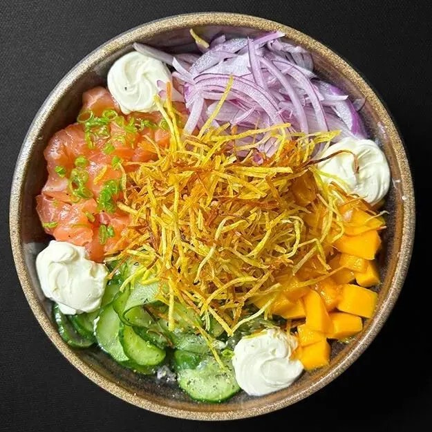 Poke Salmão - Sabor irresistível - Base de Arroz Japonês - Suculentos pedaços de Salmão Fresco em cubos -Sunomono leve e refrescante - Manga cortadas em cubos -Cebola Roxa fatiada - Cream cheese cremoso e saboroso - Batata-doce crispy crocante - Finalizado com cebolinha e gergelim torrado Acompanha: 1 Hashi, 3 Shoyu, 3 Tarê. Caso queira remover alguma coisa, basta colocar na observação.