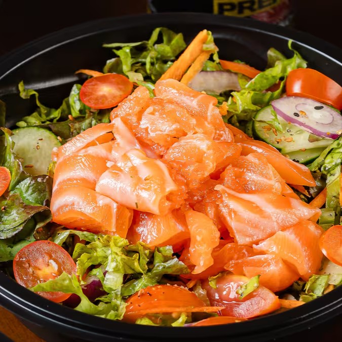 Mix de folhas , tomate cereja , salmão em cubos , pepino , cenoura ralada , cebolha roxa e gergilim.