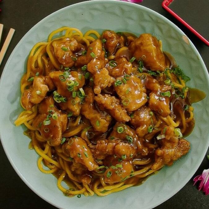 Macarrao de Yakisoba com frango empanado crispy, levemente apimentado ( contem pimenta srirracha) picancia media
