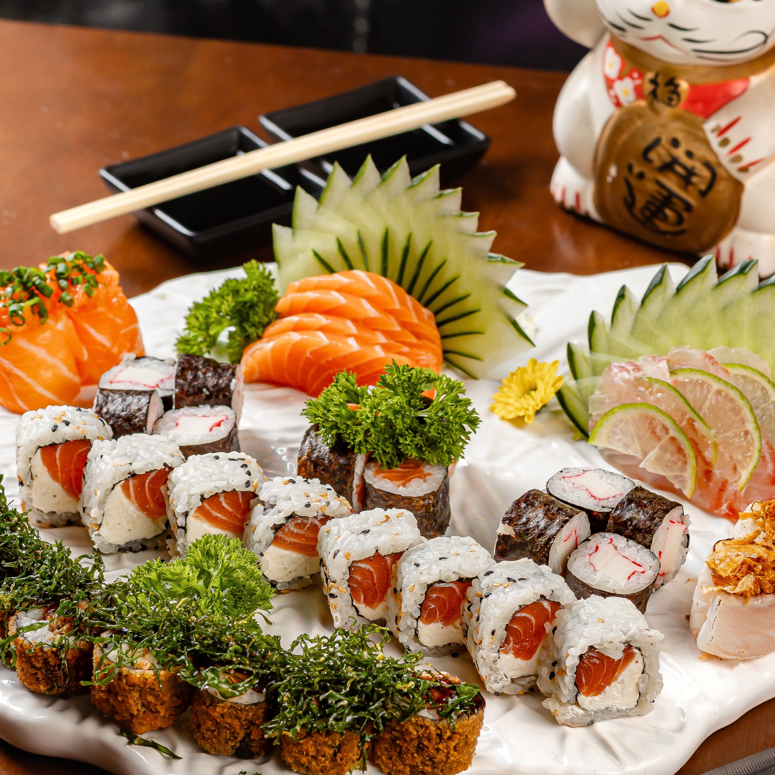 Experimente o Fusão do Mar, um combinado especial com 20 peças de sashimis , 5 salmão , 5 atum , 5 prego e 5 tilápia .