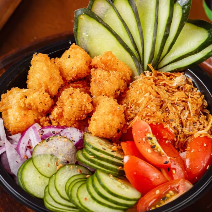 Frango em cubos na panko, arroz japonês, cebola roxa, tomate cereja, cebola crispy e um molho tarê. Finalizado com gergelim e cebolete.