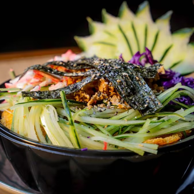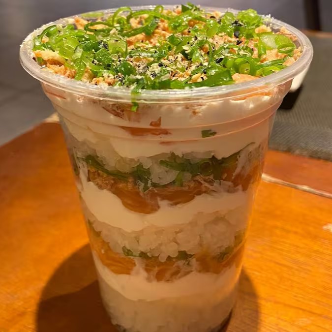Arroz japonês, salmão , molho especial da casa, cebola roxa, pepino agridoce, kani, manga, cebola crispy e nori picado.