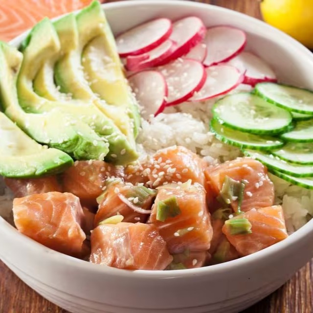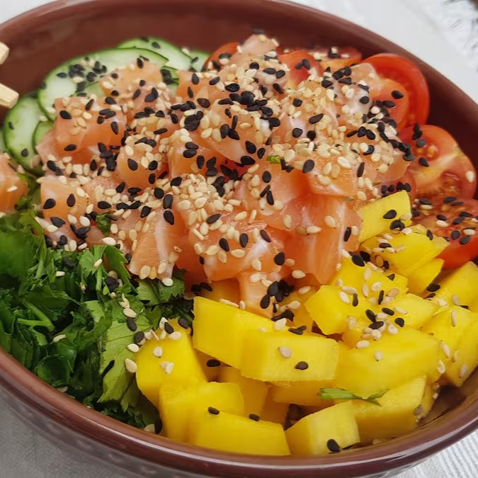 Arroz , Salmão Cru, Cream Chesse< Cenoura Ralada, Manga, Batata Doce frita Cebolinha e Tare da Casa