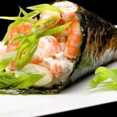 Nori crocante recheado com arroz, salmão macio, camarão frito, cream cheese e cebolinha. Uma combinação marcante de sabores e texturas!