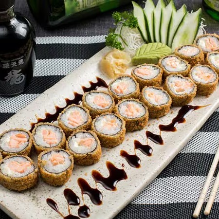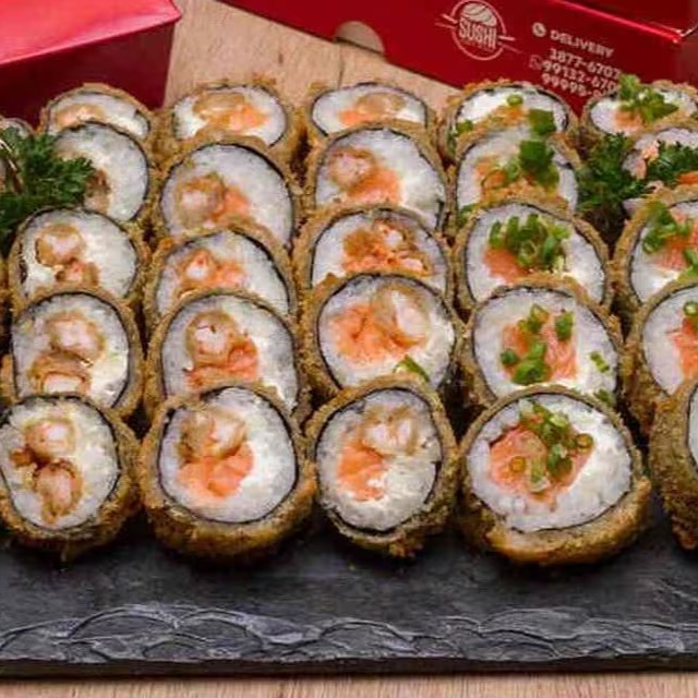 Nori , Arroz, Gergelim, salmão, Camarão frito, Cream Chesse e Cebolinha