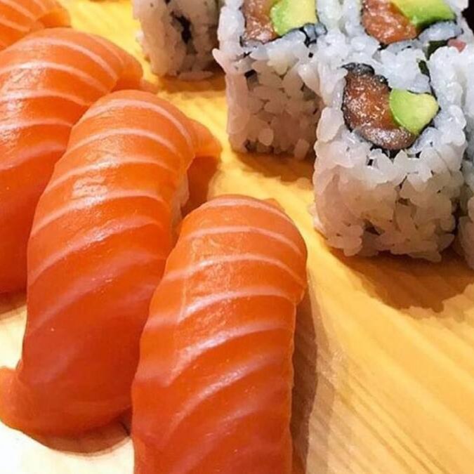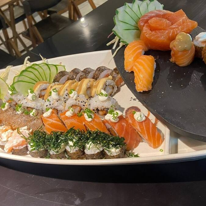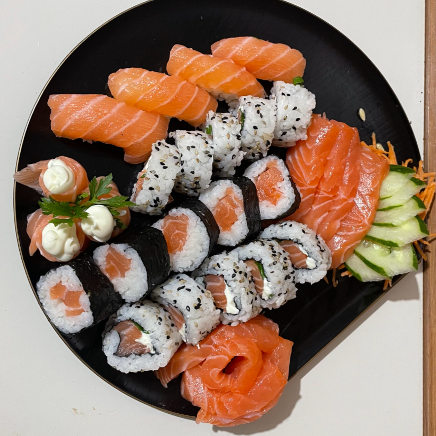 5 Sashimi de Salmão, 3 Niguiri de Salmão, 3 Joy, 5 Hot filadelfia, 5 Hossomaki Salmão, 10 Uramaki Camarão, 5 Sushi Salmão Laminado, 5 Sushi Jou Roll De Salmão, 5 Sushi Couve Frito, 5 Skin Salmão Laminado