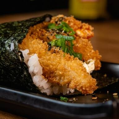 Nori crocante recheado com arroz japonês, camarão empanado e frito, cream cheese cremoso e cebolinha fresca. Uma combinação irresistível de texturas e sabor!