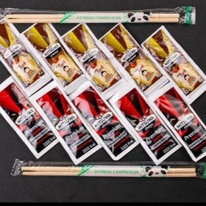Hashi de bambu + sachês de shoyu e tare pra completar seu combo japonês do jeito certo.