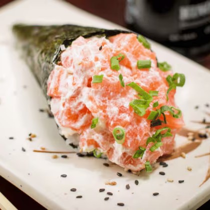 Nori crocante, arroz temperado, pele de salmão frita, cremoso cream cheese e toque de cebolinha fresca. Uma explosão de sabor e textura em cada mordida!