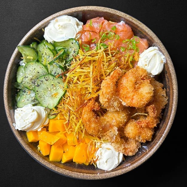 O Poke de Camarão Empanado combina crocância e frescor em uma receita deliciosa. - Base de Arroz Japonês - Suculentos pedaços de Salmão Fresco em cubos - Sunomoso leve e saboroso - Manga cortadas em cubos - Camarões Empanados Crocantes - Cream cheese cremoso e saboroso - Batata-doce crispy crocante - Finalizado com cebolinha e gergelim torrado Acompanha: 1 Hashi, 3 Shoyu, 3 Tarê. Caso queira remover alguma coisa, basta colocar na observação.
