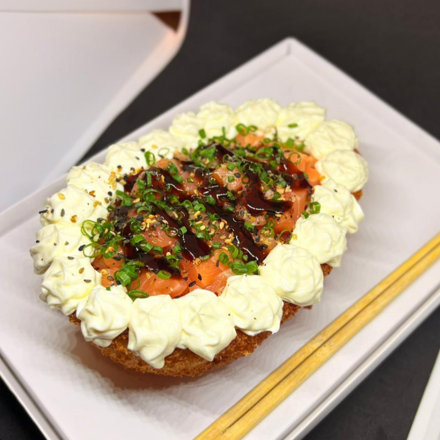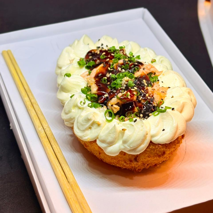 Uma combinação perfeita de crocância e sabor marcante! Nosso Ovo de Sushi de Salmão Grelhado começa com uma base de arroz japonês empanada na farinha panko e frita, criando uma casquinha dourada e crocante irresistível. Por cima, adicionamos cream cheese cremoso, seguido de cubos de salmão grelhado, que trazem um sabor intenso e levemente defumado. Finalizamos com cebolinha fresca e gergelim torrado, e mais uma camada especial de cream cheese, garantindo ainda mais cremosidade em cada Hashizada