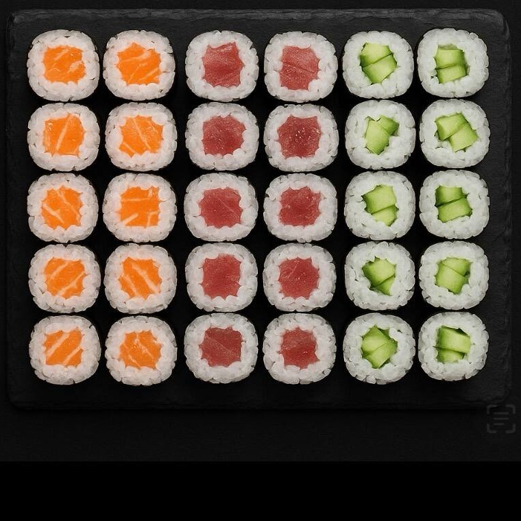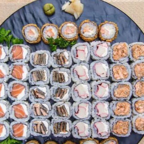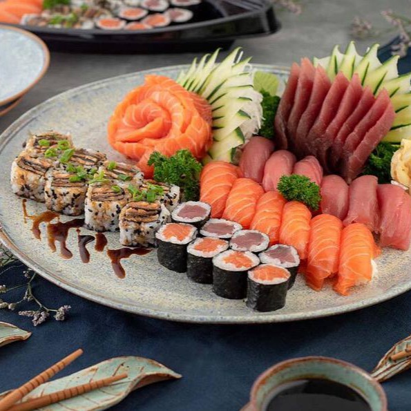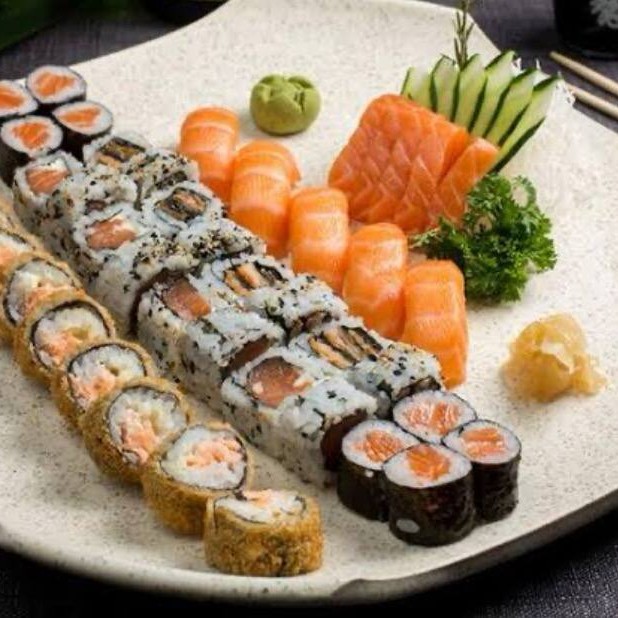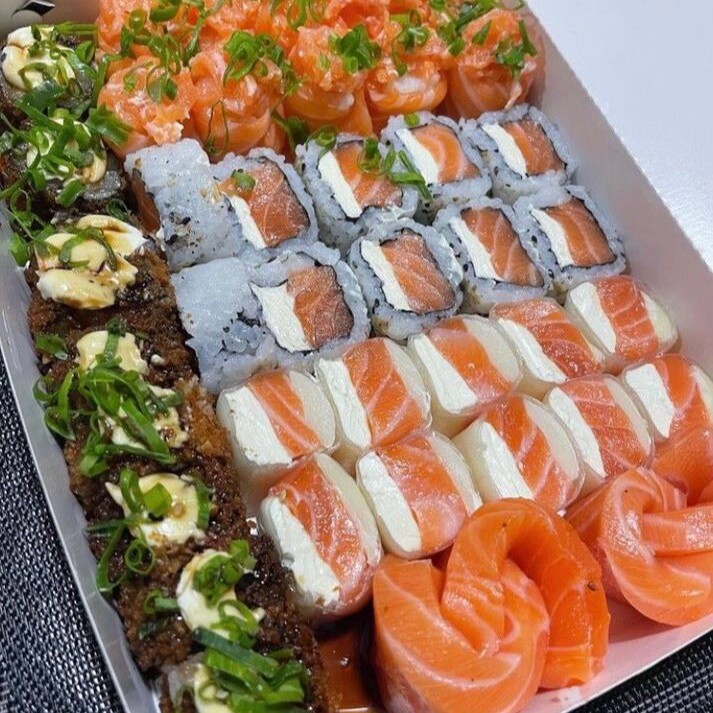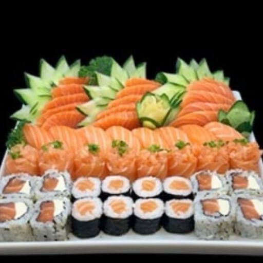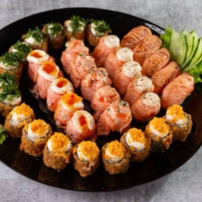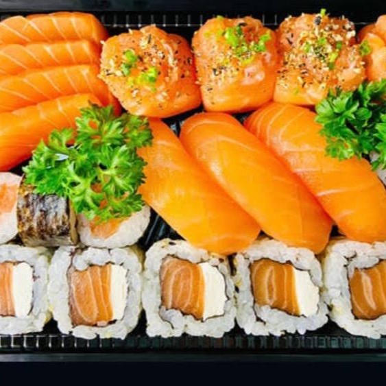 10 Uramaki Skin , 10 Hot Filadelfia , 10 Niguiri salmão 10 Hossomaki Skin