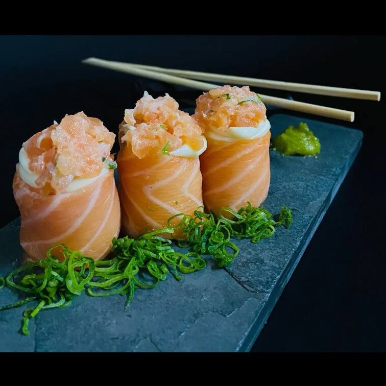 Enroladinho de salmão maçaricado com cream cheese, molho de pimenta doce e cebolinha. Uma combinação de sabores intensos e delicados, com a cremosidade do cream cheese, o toque defumado do salmão maçaricado e o sabor levemente adocicado e picante do molho, finalizada com a frescor da cebolinha. Uma explosão de sabor!
