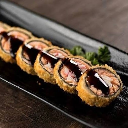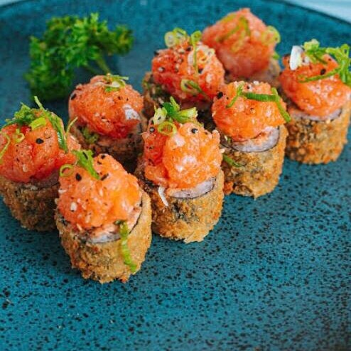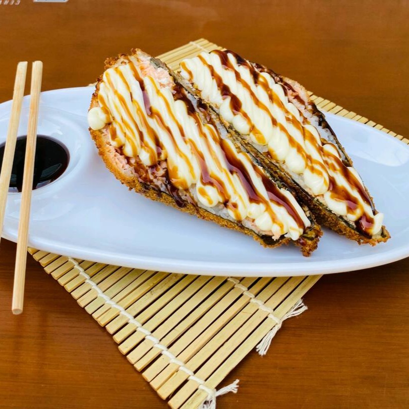 Hot Holl com arroz espalhado na alga, recheado com salmão, cream cheese, molho tare e pasta de salmão. Uma combinação perfeita de sabores intensos e cremosos, com um toque adocicado do molho tare e a cremosidade da pasta de salmão. Uma verdadeira explosão de sabor!