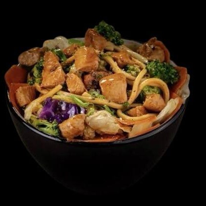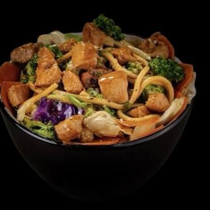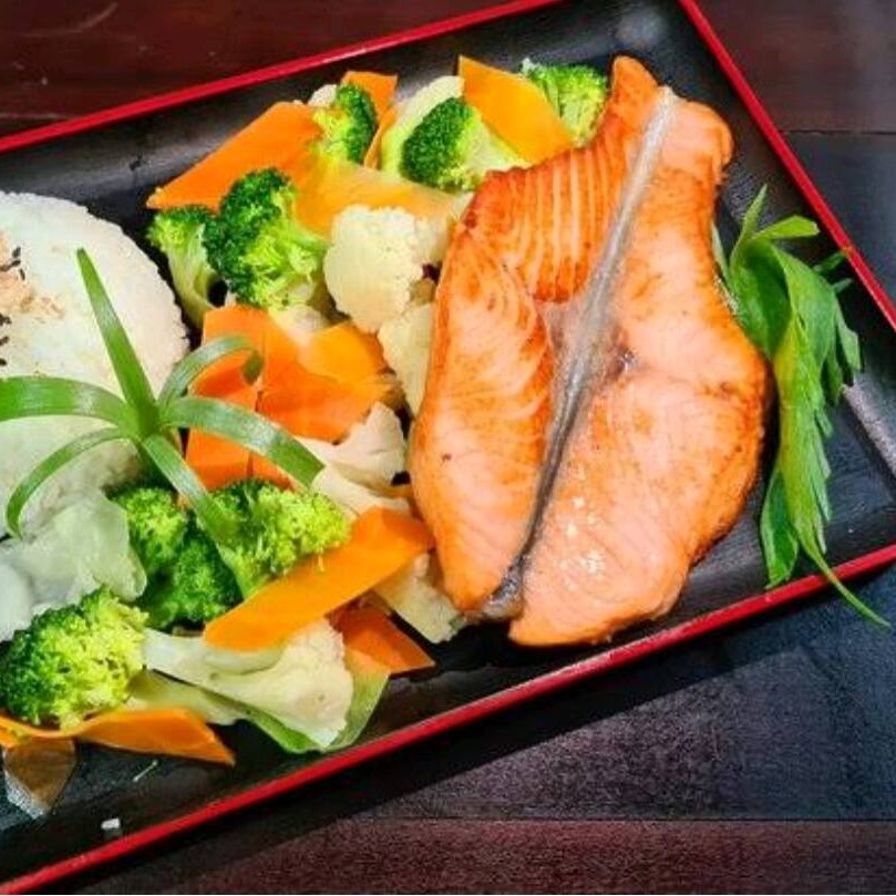 Teppan de Salmão: seleta de legumes refogados no shoyu, 100 gramas de salmão grelhado, acompanhados de arroz branco. Uma combinação deliciosa de sabores com o toque salgado do shoyu, a suculência do salmão grelhado e o arroz leve para completar. Uma refeição saborosa e equilibrada!