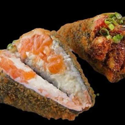 Hot Holl com arroz espalhado na alga, recheado com cream cheese e salmão empanado na farinha panko especial. Uma explosão de crocância por fora, combinada com a suavidade do cream cheese e o sabor marcante do salmão. Uma verdadeira delícia!