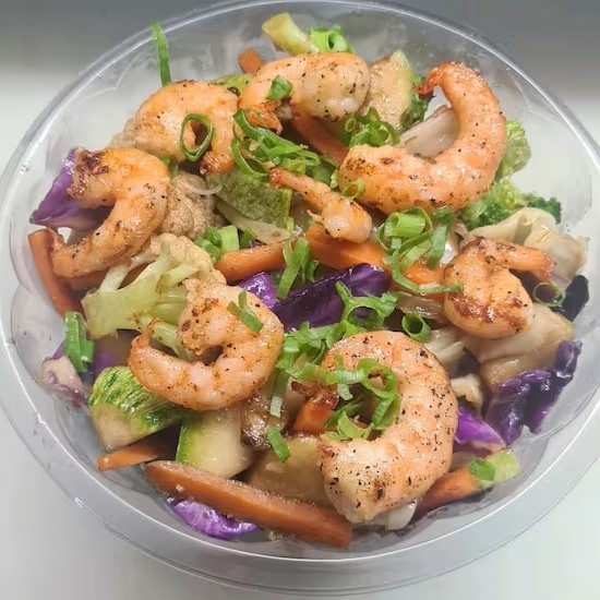 Camarão refogado na manteiga (Domburi) com seleta de legumes. Camarões suculentos, salteados na manteiga, combinados com legumes frescos e refogados,Arroz, criando um prato delicioso e cheio de sabor. Perfeito para quem ama um toque de manteiga e frescor no prato!