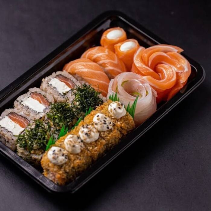 Combinado especial com base de cream cheese, 5 unidades de salmão Joe, 5 sashimis de salmão, 5 bolinhos de salmão, 5 uramakis Filadélfia e 2 harumakis de salmão cortados ao meio. Uma mistura deliciosa e cheia de sabor!