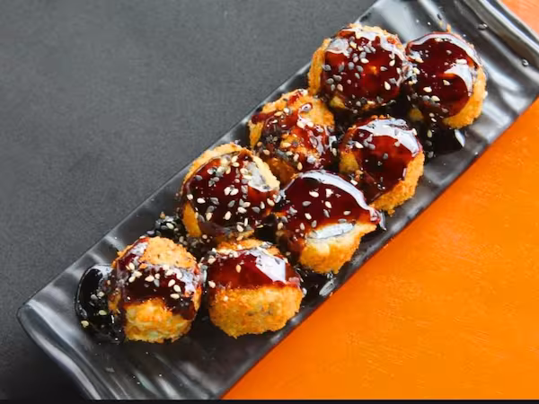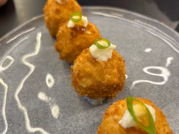 Delicioso bolinho de salmão preparado cuidadosamente com salmão grelhado temperado e cream cheese, empanado em farinha panko e frito em óleo de algodão.