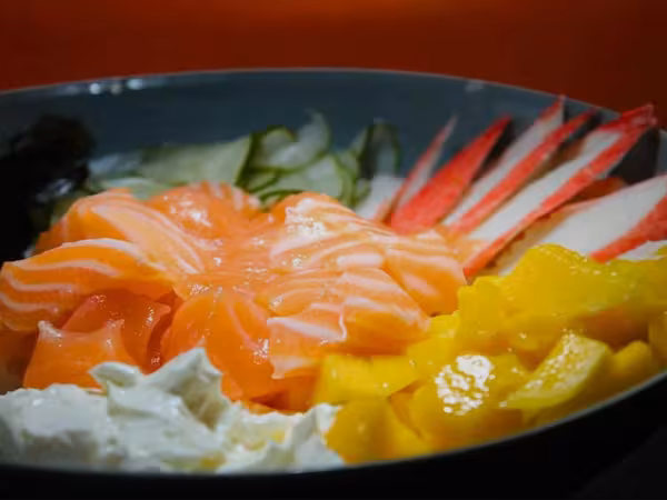 Shari (arroz japonês), salmão fresco em cubos, sunomono, cebola roxa, manga, finalizado com molho tarê especial da casa e gergelim.