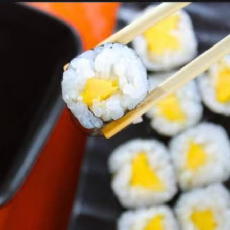 Sushi tradicional composto por alga nori, arroz e recheio de manga.
