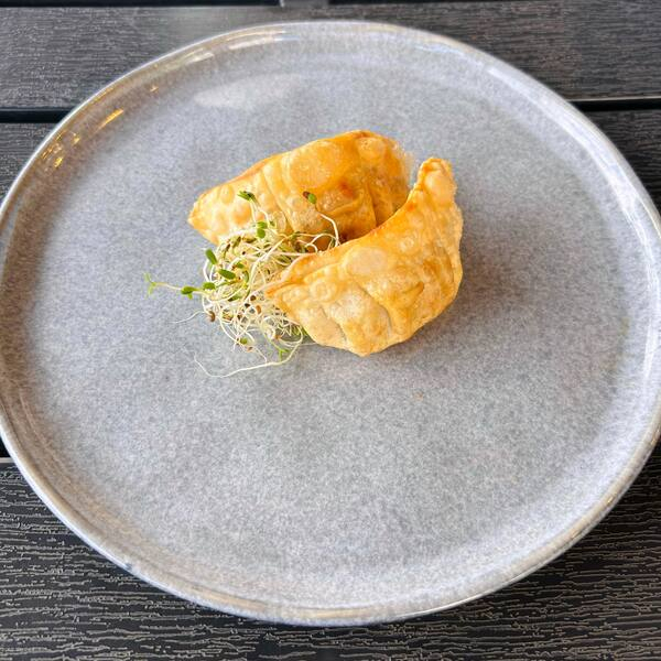 Trouxinha feita com massa de pastel, recheada com patê de salmão grelhado temperadinho e cream cheese.