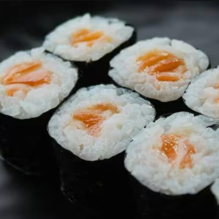 Sushi tradicional composto por alga nori, arroz e recheio de salmão fresco.