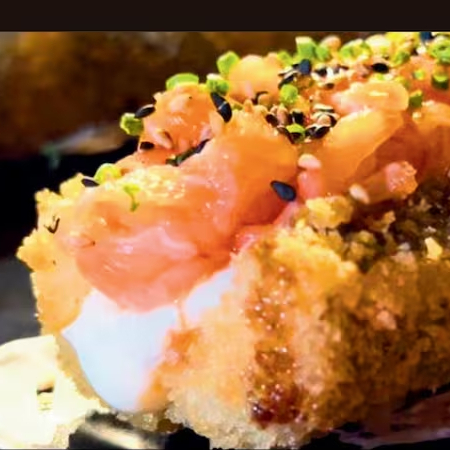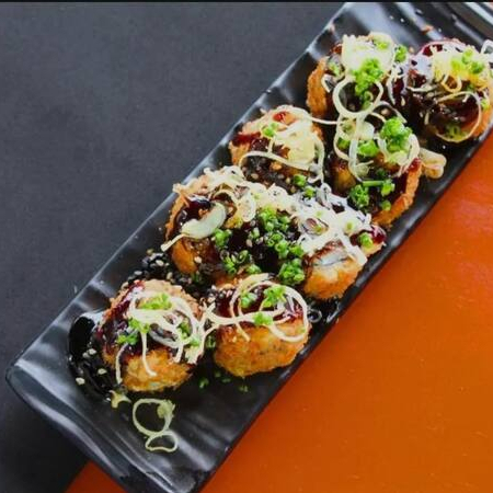 Delicioso enrolado de alga Nori, arroz Shari, empanado na farinha Panko e frito em óleo de algodão, recheado com cream cheese, salmão grelhado em cubos, finalizado com um delicioso molho tarê da casa, gergelim e cebolinha