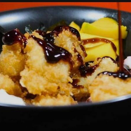 Shari (arroz japonês), tilápia empanada e frita, cream cheese, sunomono, cebola roxa, manga, finalizado com molho tarê especial da casa e gergelim.