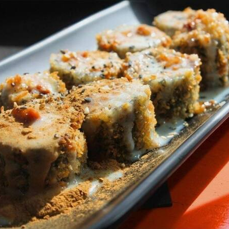 Delicioso enrolado de alga Nori, arroz Shari, empanado em farinha Panko e frito em óleo de algodão, recheado com cream cheese e camarão empanado, finalizado com um delicioso molho tarê da casa, gergelim e cebolinha